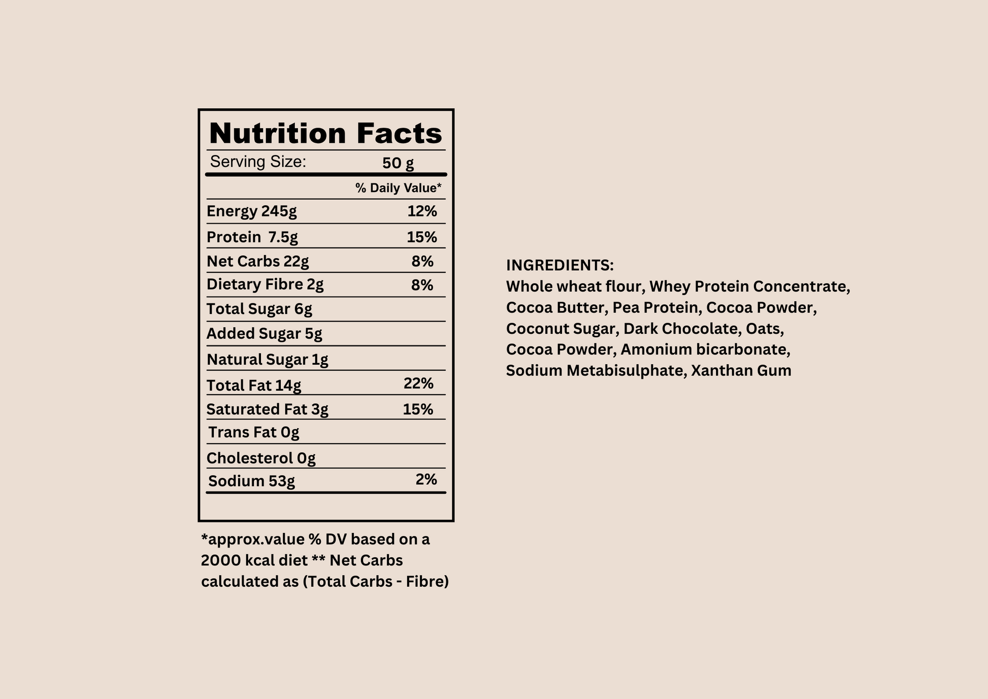 Whole wheat flour, Whey Protein Concentrate, Cocoa Butter, Pea Protein, Cocoa Powder, Coconut Sugar, Dark Chocolate, Oats, Cocoa Powder, Amonium bicarbonate, Sodium Metabisulphate, Xanthan Gum